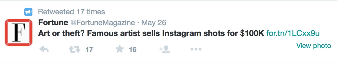 My gut reaction was to think that New York artist Richard Prince’s canvases featuring other people’s Instagram photos is a clear case of copyright infringement. To paint a complete picture (pun intended), it must be noted that Prince has added a short message posted as a comment below what is otherwise just a screen shot of the original image.